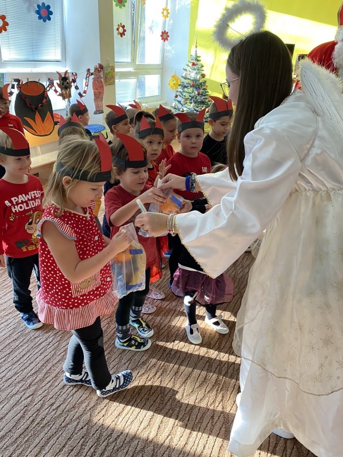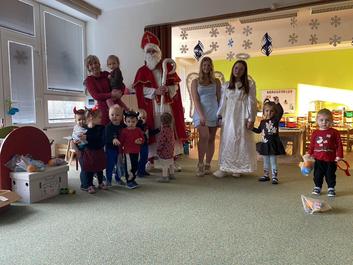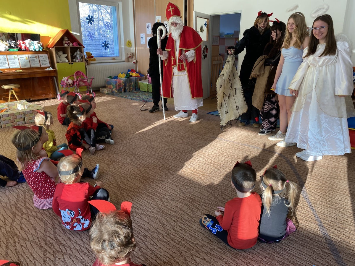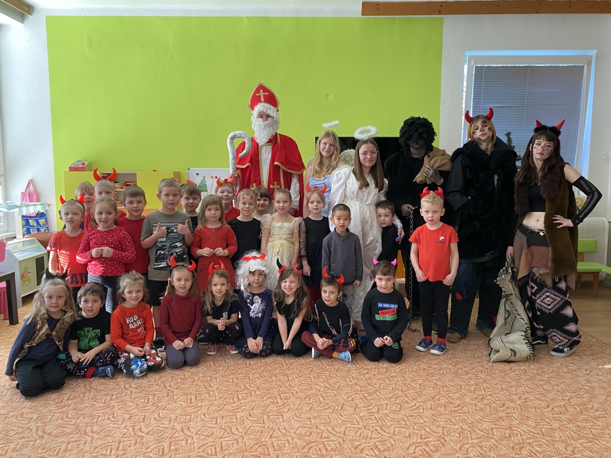 Vrchol dne přišel dopoledne, kdy do školky dorazil samotný Mikuláš v doprovodu laskavých andělů a malinko strašidelných čertů. Děti Mikulášovi zazpívaly písničku a přednesly básničky, za což si zasloužily sladké balíčky plné dobrot. Mikuláš všechny pochválil za jejich šikovnost a pilnost, ale nezapomněl ani na drobné připomenutí, aby byly poslušné i nadále.