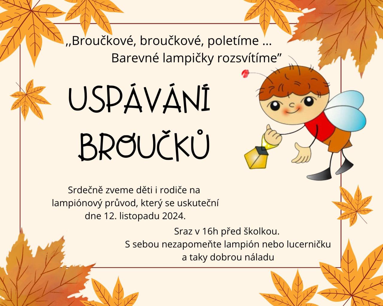 Srdečně zveme děti i rodiče na lampiónový průvod, který se uskuteční dne 12.11. 2024. Sraz v 16h před školkou. S sebou nezapomeňte lampión nebo lucerničku a taky dobrou náladu.