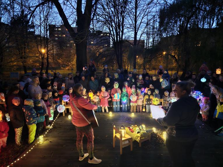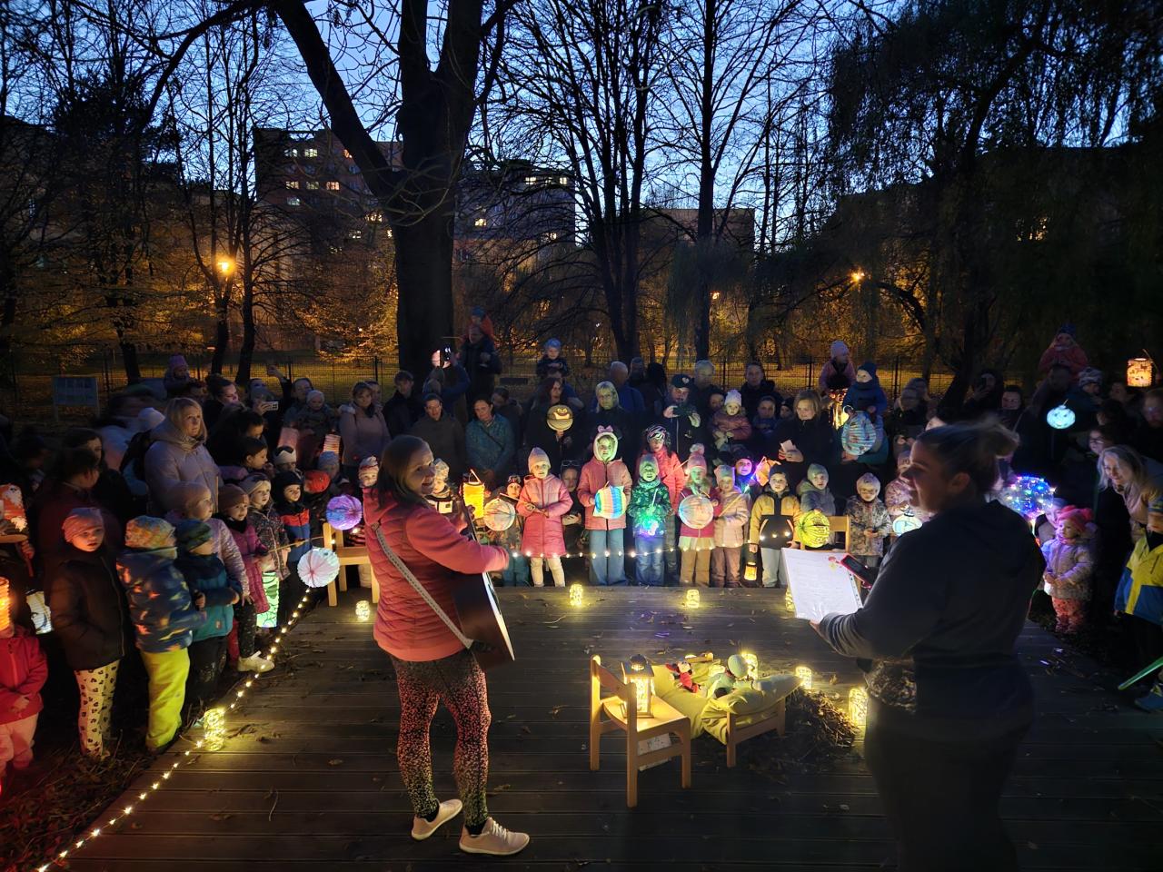 Odpoledne se sešlo několik desítek natěšených dětí spolu se svými rodiči a vybaveni lucerničkami jsme se společně vydali na lampiónový průvod do blízkého okolí. Udělali jsme si malou procházku kolem naší školy a poté jsme se vrátili na školní zahradu, která byla krásně osvětlena snad miliónem světýlek. Uložili jsme do dřevěné postýlky broučka i berušku, zazpívali si spolu s kytarou již známou písničku „Broučkové poletíme“ a vydali se spokojeni a šťastni domů do svých postýlek.
