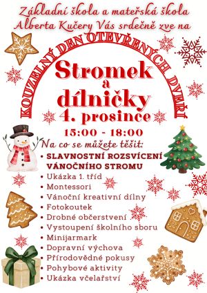 ZŠ Alberta Kučery zve všechny děti, rodiče i přátele školy na předvánoční odpoledne plné tvoření, zábavy a slavnostní atmosféry.