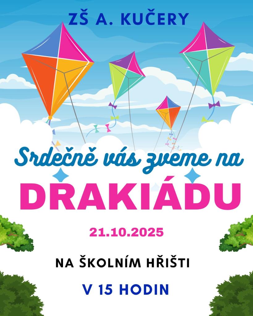 Základní škola A. Kučery srdečně zve všechny děti, rodiče i prarodiče na Drakiádu, která se uskuteční 21. října 2025 od 15:00 hodin na školním hřišti.