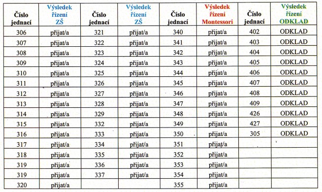 Ředitel Základní a mateřské školy Ostrava-Hrabůvka, A. Kučery 20, příspěvková organizace rozhodl v souladu s § 46, § 165 odst. 2 a § 183 odst. 2 zákona č. 561/2004 Sb., o předškolním, základním, středním, vyšším odborném a jiném vzdělávání (školský zákon), vyhovět žádosti o přijetí či o odkladu k základnímu vzdělávání v Základní škole a mateřské škole Ostrava-Hrabůvka, A. Kučery 20, příspěvková organizace níže uvedeným uchazečům: