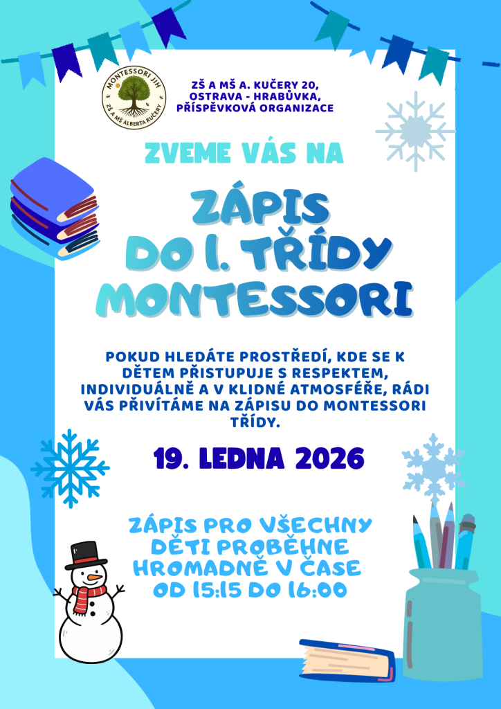 Rádi bychom pozvali všechny rodiče a jejich děti na zápis do montessori třídy, který se bude konat 19. 1. 2026 od 15:15 do 16:00. Montessori přístup nabízí dětem prostředí, kde mohou růst vlastním tempem, objevovat nové věci s nadšením a rozvíjet svou samostatnost, kreativitu i sebevědomí.
