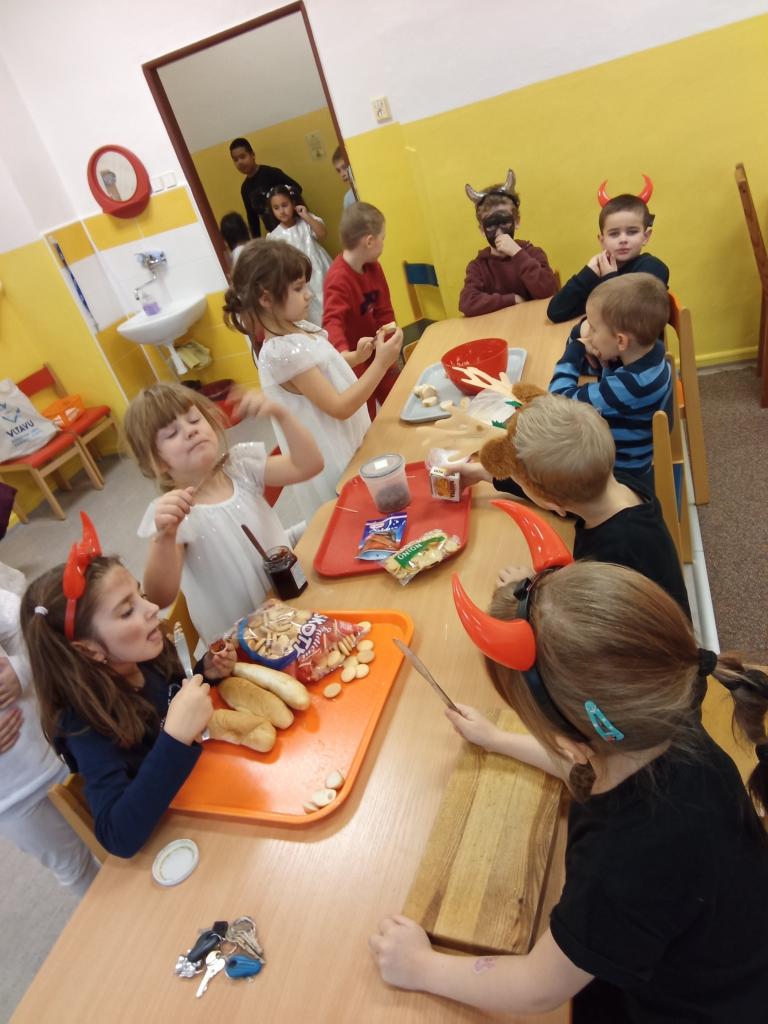 V pátek se školní družina proměnila v malé peklíčko. Už od rána přicházely děti s rohy, umouněnými tvářemi i v čertovských kožíšcích. Aby peklo nebylo přeplněné, dorazili také andílci a víly.