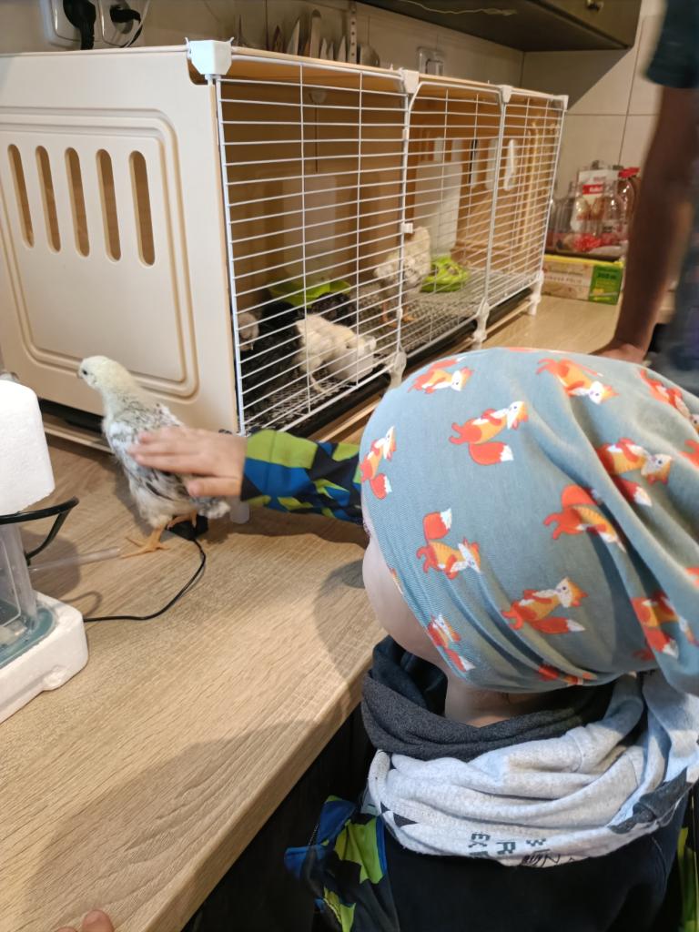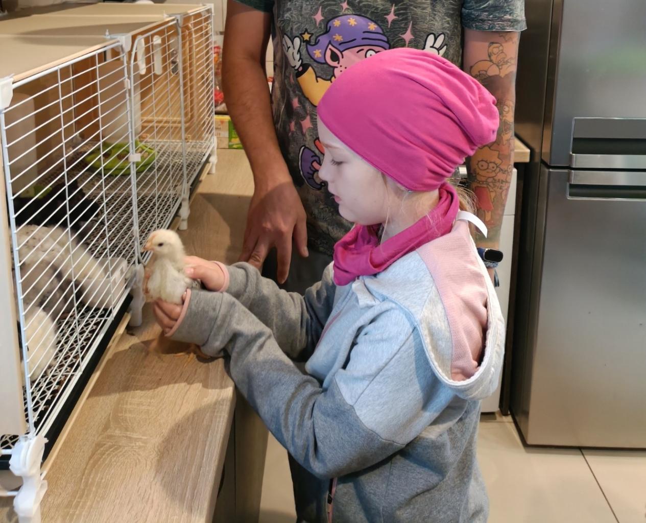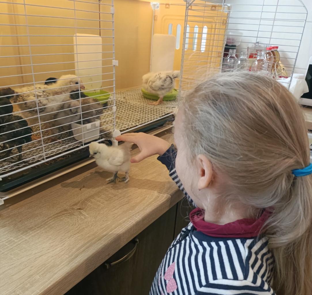 Potom jsme přešli ke kleci, kde už běhala žlutá, hebká kuřátka. Všechna vesele pípala a hledala teplo pod lampou. Děti si je mohly opatrně vzít do rukou a pohladit. Byly nadšené, že si mohla kuřátka zblízka prohlédnout a chvíli je podržet.