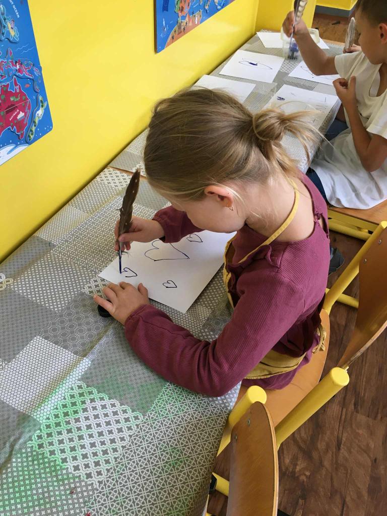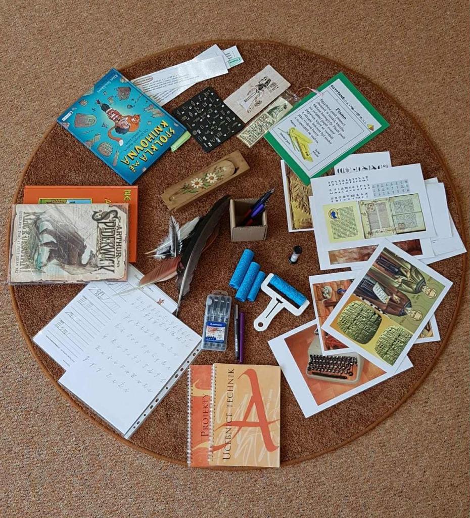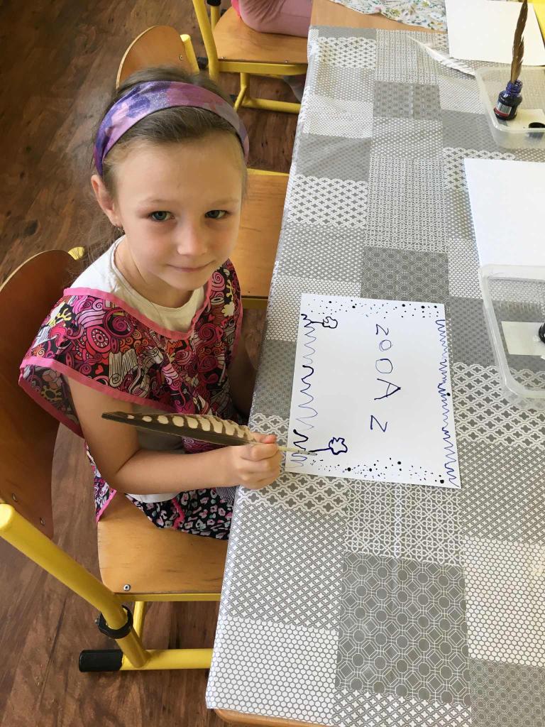 Ukázali jsme si různé způsoby psaní od jeskynních maleb přes klínové písmo a hieroglyfy až po písmena, která používáme dnes. Děti si mohly samy vybrat, jak si písmo vyzkouší – někdo psal do písku, jiný zkoušel kreslit symboly, psát inkoustem a brkem nebo porovnávat, jak se písmo postupně vyvíjelo.