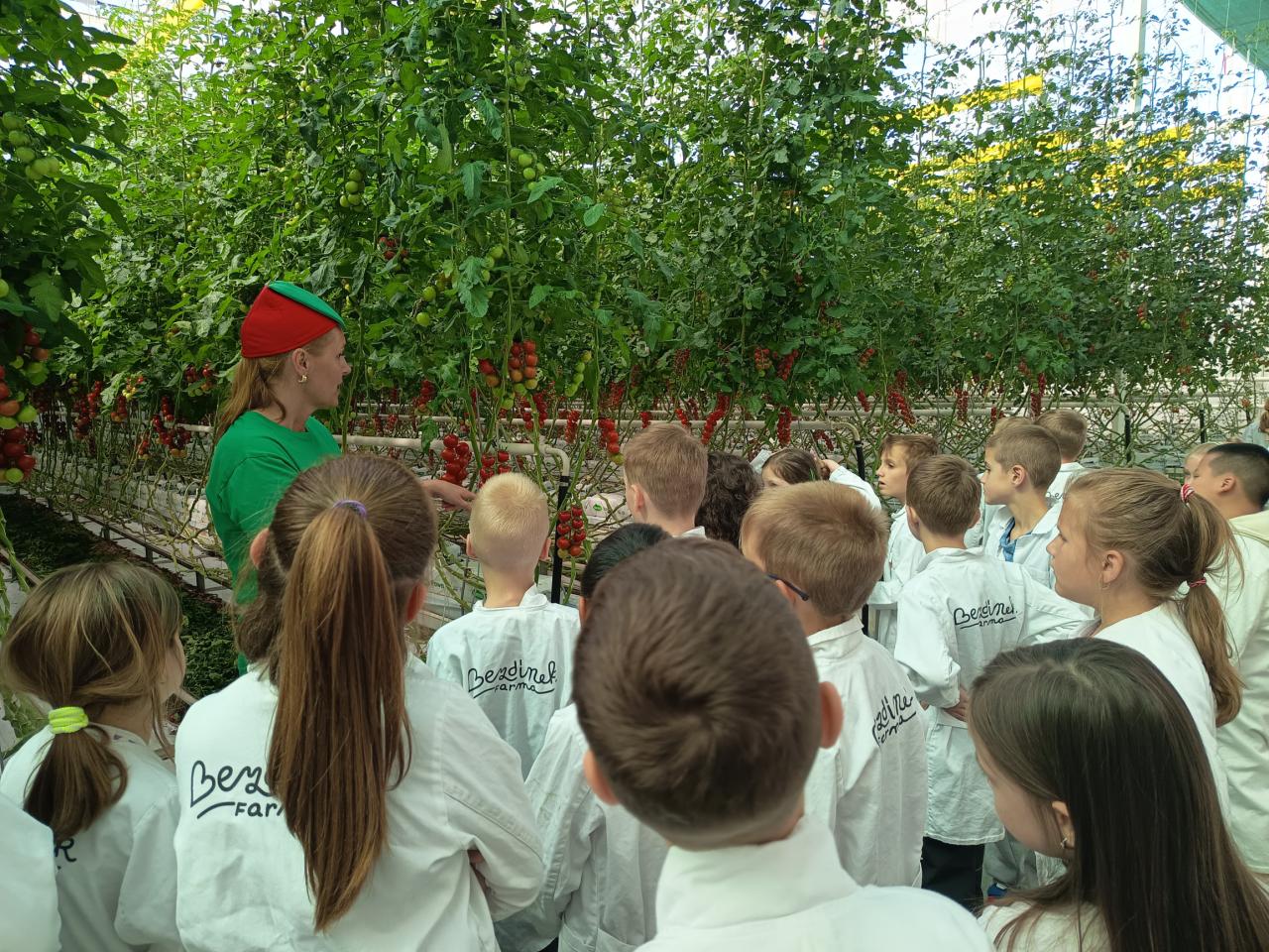 Ve středu 28. května jsme navštívili farmu Bezdínek, která pěstuje rajčata a okurky. Sklizeň probíhá v plné zralosti, proto chutnají tak výborně. V úvodu exkurze jsme shlédli krátký film o farmě a kampani Půl talíře. Povídali jsme si o zdravém stravování, proč je tak důležité jíst denně zeleninu a ovoce. V expozici jsme pozorovali druhy rajčat i okurek, naučné panely, čmeláky, pod mikroskopem larvy přirozených škůdců. V ukázkovém skleníku jsme si prohlédli pěstování rajčat a okurek, viděli jsme, jak se rostliny kontrolují. Nakonec jsme rajčata i okurky ochutnali. Na jejich vůni a chuť nelze zapomenout. Edukačně-zábavné pracovní listy, omalovánky a dobrůtky z místní prodejny jsme si odvezli domů.