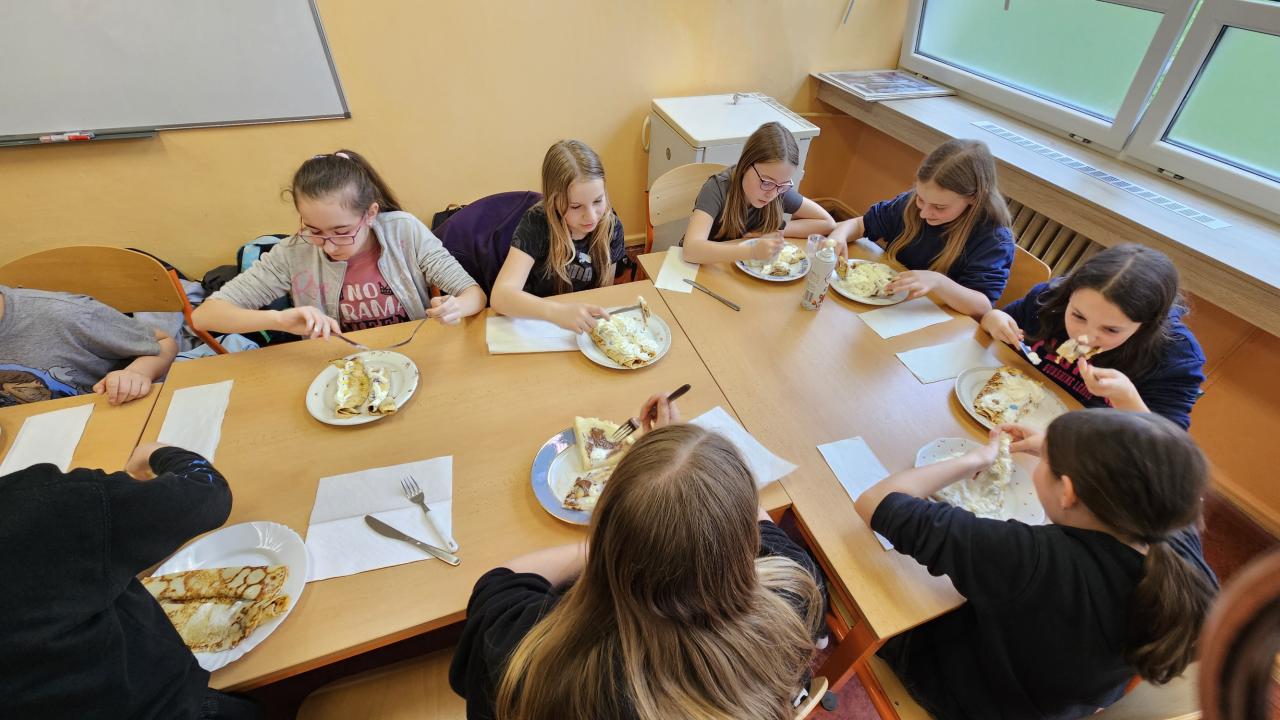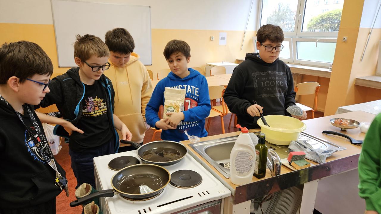 Kolektiv 5.B se rozdělil na 3 skupiny a všichni se ve svých skupinach domluvili, kdo donese jaké suroviny, aby mohly vzniknout nezapomenutelné palačinky na této nezapomenutelné akci ;) Družstvo kluků bylo naprosto senzační, naučili se manipulovat s obracečkou, dávkovat správné množství oleje na smažení, a hlavně - obracet palačinky!