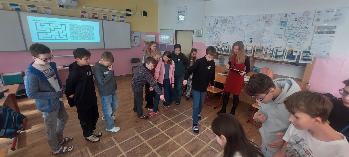 Součástí druhého bloku byla zážitková stmelovací hra Labyrint, ve které si žáci prakticky vyzkoušeli, jaké kroky jsou třeba udělat k tomu, aby ve svých životech mohli měnit minusy na plusy.
