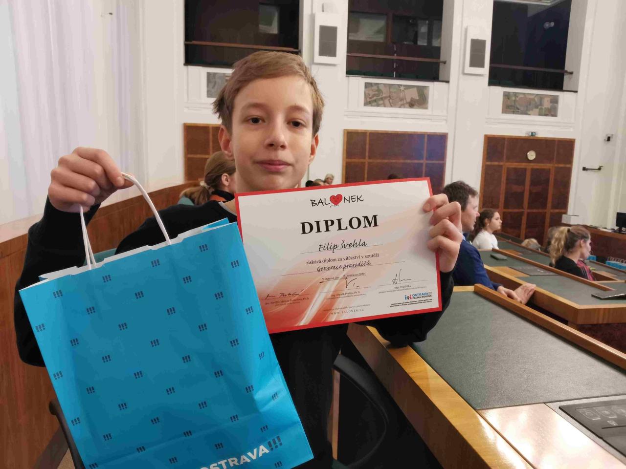 Cílem soutěže bylo zachytit jedinečnou atmosféru doby, v níž prožili dětství prarodiče žáků, a porovnat ji se současností – ať už formou vyprávění, povídky nebo úvahy. Filipova práce byla oceněna odbornou porotou za výjimečné zpracování tématu. Gratulujeme k tomuto mimořádnému úspěchu a děkujeme za skvělou reprezentaci školy!