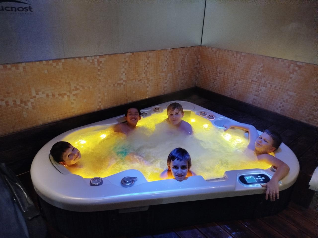 Po obědě následoval zasloužený polední klid, během kterého děti opravdu načerpaly nové síly. A dobře udělaly – čekalo nás totiž odpoledne plné relaxace v místním wellness. Užili jsme si jak vířivku, tak saunu, což dětem dopřálo dokonalý odpočinek po aktivním dopoledni.